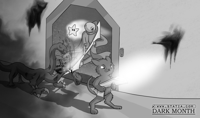 He found the door to the room they'd arrived in. Thick obscuring mist flowed out of it, and from within he could hear the wisp and crash of more creatures escaping the portal. Creatures masked in the pitch chittered around him, standing his fur on end. Then a distinct growl crawled through his bones.