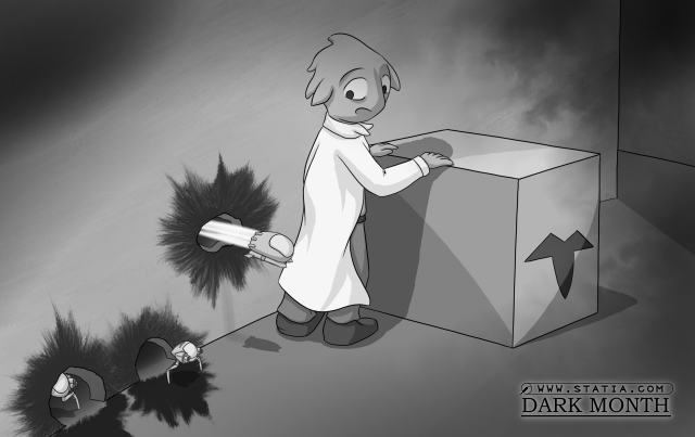 Meanwhile, Stickman had left Cat with Tokux. Hoisting the heavy rifle, he proceeded into the hallway, heading back to the room with the great black vortex. One of the weapons he bore might just blast the thing shut. He heard the shots from Stickman's pistols. Howls echoed through the hallways. The storage room door sealed and locked. Tokux would be safe at least.