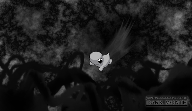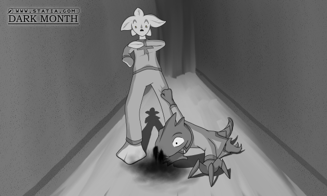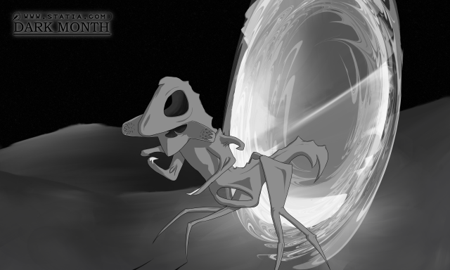 Snapping around, the feline looked behind him. The landscape was bathed in a brilliant light coming from the centre of the statue. Within the ring lay a different world, the hallway of the nightmare they had escaped from. And standing before it was a twisted creature of bone and flesh. Its skull was empty, yet it had a mouth that opened sideways, revealing many fine inwards facing teeth. Its body was gaunt and had one large hole through it, seemingly natural. Its arms and legs were split, with smaller appendages at the upper joint. Each step it too seemed new, feeble, but it was rapidly gaining familiarity with this world and how to move. It turned to face them with its sightless face.