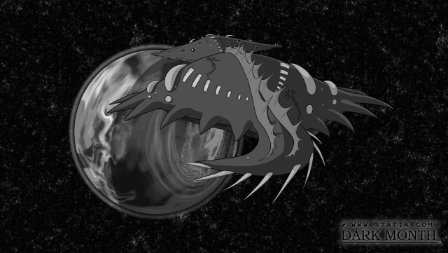 He then felt a vibration run throughout the cracked support beam he was secured to. Looking around urgently, he spotted a vessel above him. It was massive and horrible. Covered in writhing and bending shapes, it challenged his senses to accept it as a ship. Long talons, kilometres across, spanned out from what looked like a tail. Spider eyes covered the front of it and twitching fins crossed the back. Odd splotchy growths covered other areas of it. It was now descending on the planet, taking no notice of him.